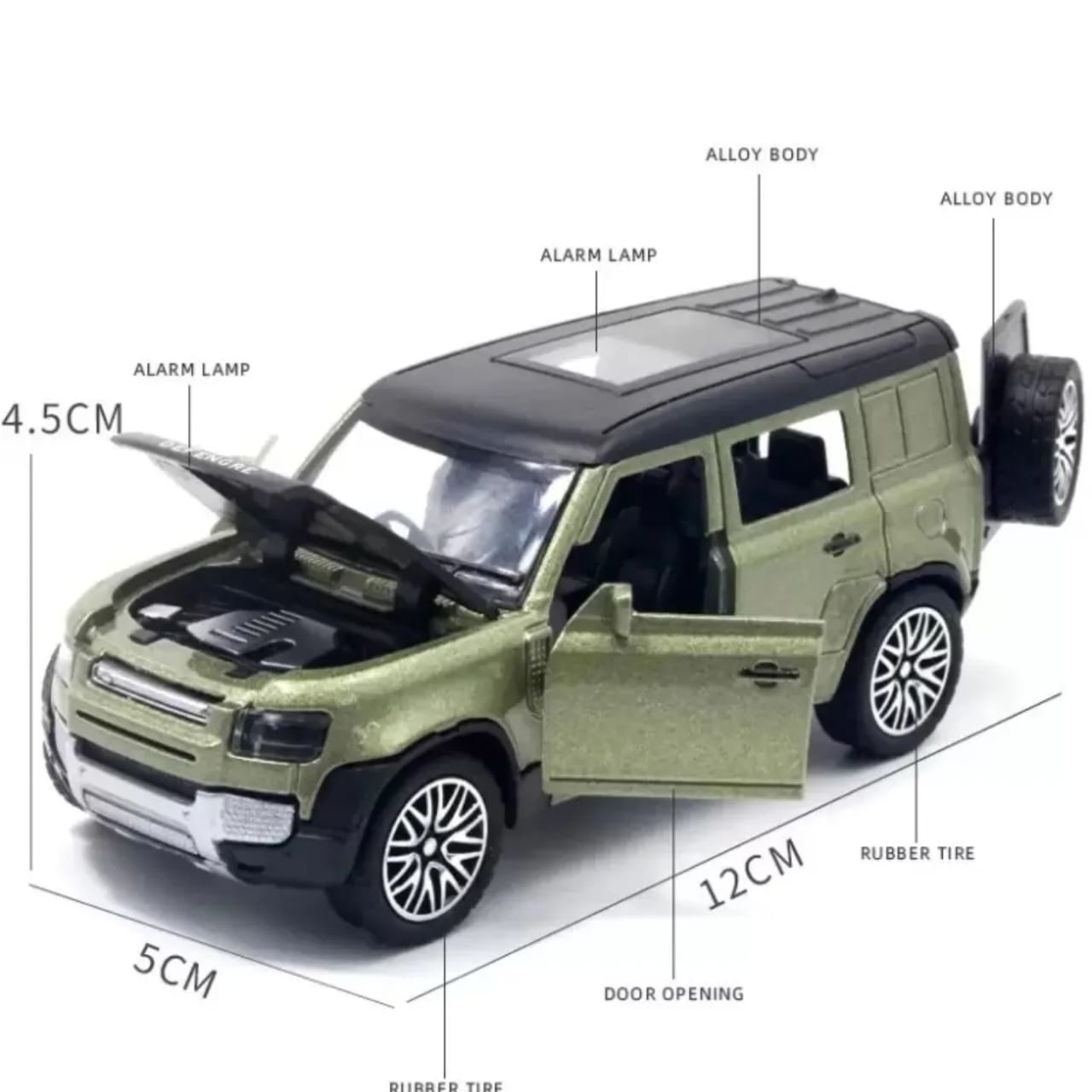 Famtoys present 1:36 scale die cast pull back defender car. This metallic green car has inbuilt high quality push back machine that makes the car go as fast as you want. The front doors , the engine compartment & the boot door can be opened manually. It is made of fine quality material with nice finishing & smooth edges. Light weight, durable & easy to carry anywhere. The Rubber Wheels create good friction on the surface making the car run smoothly and fast. Its Latest & Trending among the new launched toy cars, kids will love to play and collect all colors. recommended for kids boys girls age 3 years & above.
